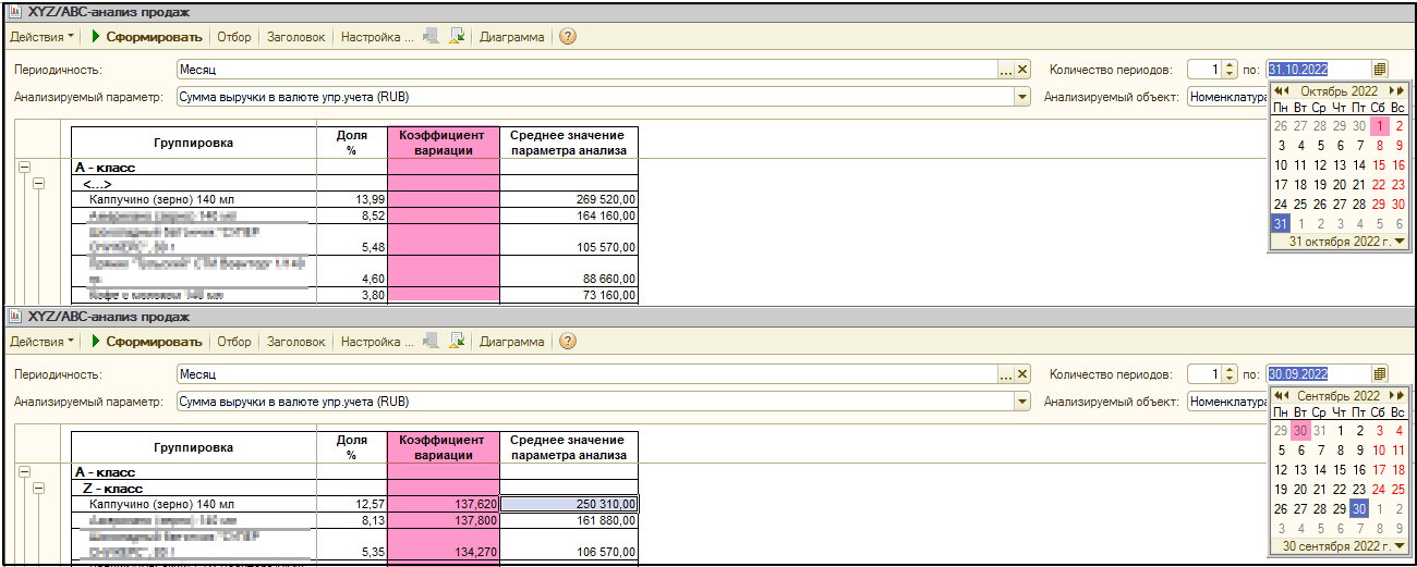 Таким образом, данные уже формируются с 30.08.2022 по 30.09.2022, т.е. анализ захватывает продажи прошлого месяца, в связи с чем рассчитывает в графе **Коэффициент вариации**.&#x20;